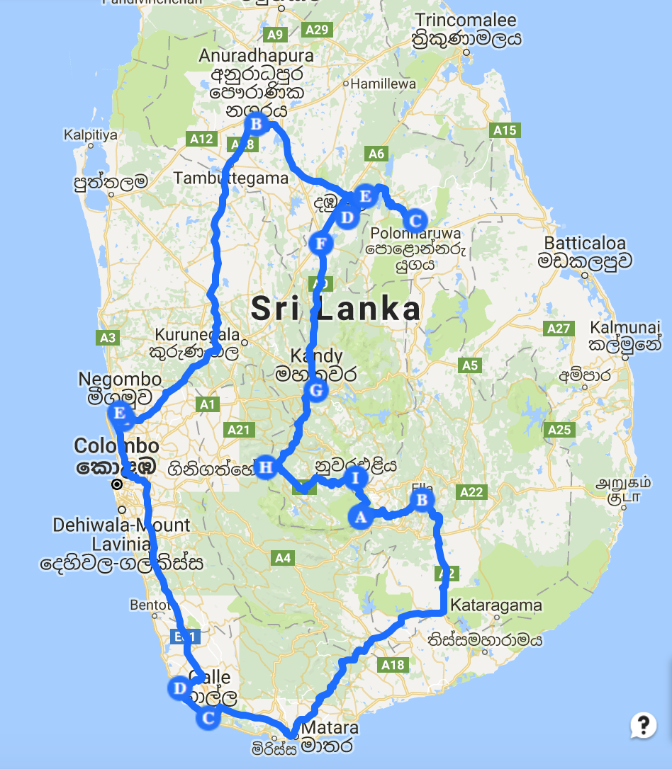 Torno a estar aquí per explicar-vos el viatge a Sri Lanka. Aquesta és la ruta que vam seguir durant dues setmanes, dedicant els primers 9-10 dies a fer una ruta per tots els punts d’interès culturals i naturals del nord i centre d’illa i els últims 3-4 dies ens vam quedar al sud per gaudir d’uns dies de relax a la platja.