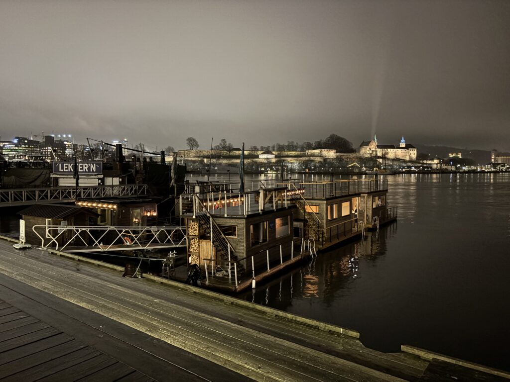 Després de fer el check-in i descansar una mica, hem anat a passejar fins a Aker Brygge, una àrea moderna plena de restaurants, cafeteries i un passeig marítim amb vistes al fiord d’Oslo. No cal dir que a les 16 h ja és negra nit i poques vistes es veien. És un lloc ideal per sentir l’ambient local i les saunes sobre el mar.