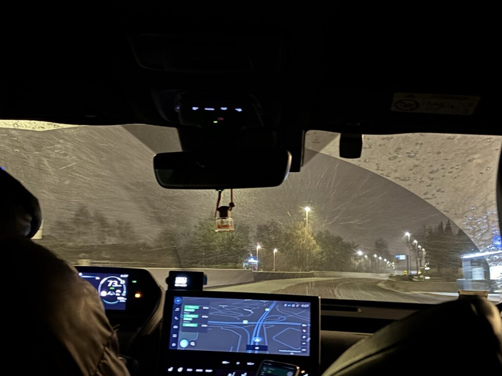 El Bolt, com no podia ser d’una altra manera, era elèctric, i hem pogut viure de primera mà l’experiència. Feia molt fred i nevava bastant, cosa que als cotxes elèctrics no els hi agrada gaire, així que hem hagut de fer una paradeta de 5’ a un súper carregador per assegurar-nos de no quedar-nos tirats.