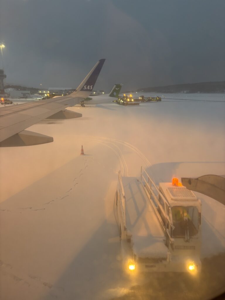 Teníem previst anar amb Flytoget, el tren que connecta el centre d’Oslo amb l’aeroport, ja que a aquella hora encara no hi havia trens regionals. Per curiositat, hem mirat quant costava un Bolt (tipus Uber) i ens sortia a uns 45 €, amb un 40% de descompte per ser nous. Com que dos bitllets de Flytoget costaven el mateix, hem decidit anar amb Bolt. També cal dir que a primera hora ja nevava força i teníem uns 10 minuts caminant fins a l’estació.