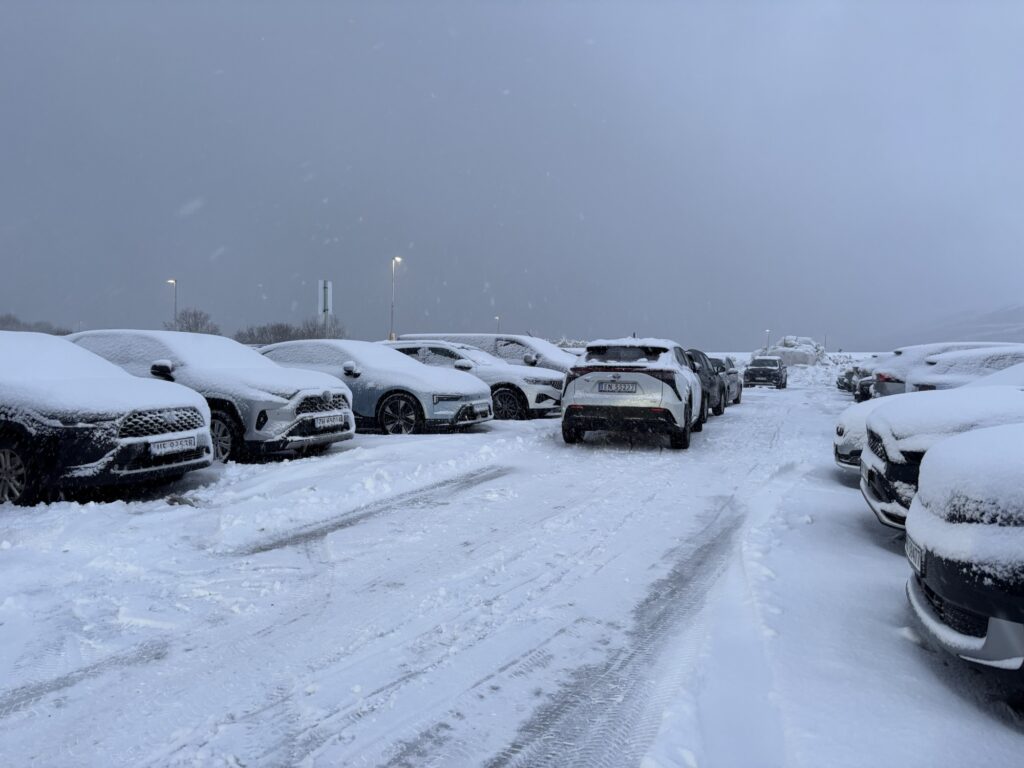 Un cop a terra, ha començat l’odissea del cotxe de lloguer. Ens han donat un súper 4×4 nou per estrenar, però estava aparcat a un parking exterior. Primer no trobàvem el parking, perquè totes les senyals estaven plenes de neu. Després, no podíem fer la tècnica d’obrir el cotxe i comprovar les llums perquè estaven tots plens de neu. Ha estat una brometa divertida! Quan l’hem trobat, hem trigat una estona en treure tot el gel i la neu de sobre.