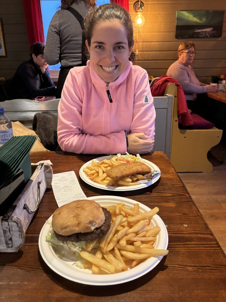 A Sommarøy hem anat a l’únic restaurant del poble (apart del de l’hotel) per fer una hamburguesa i un fish & chips, que estaven molt bons!