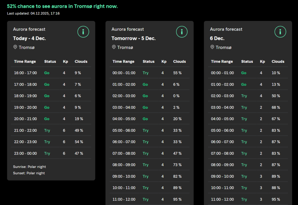 Hi ha moltĂssimes apps / webs, però aquesta Ă©s la que mĂ©s fĂ cil Ă©s: https://www.norway-lights.com/destinations/tromso
